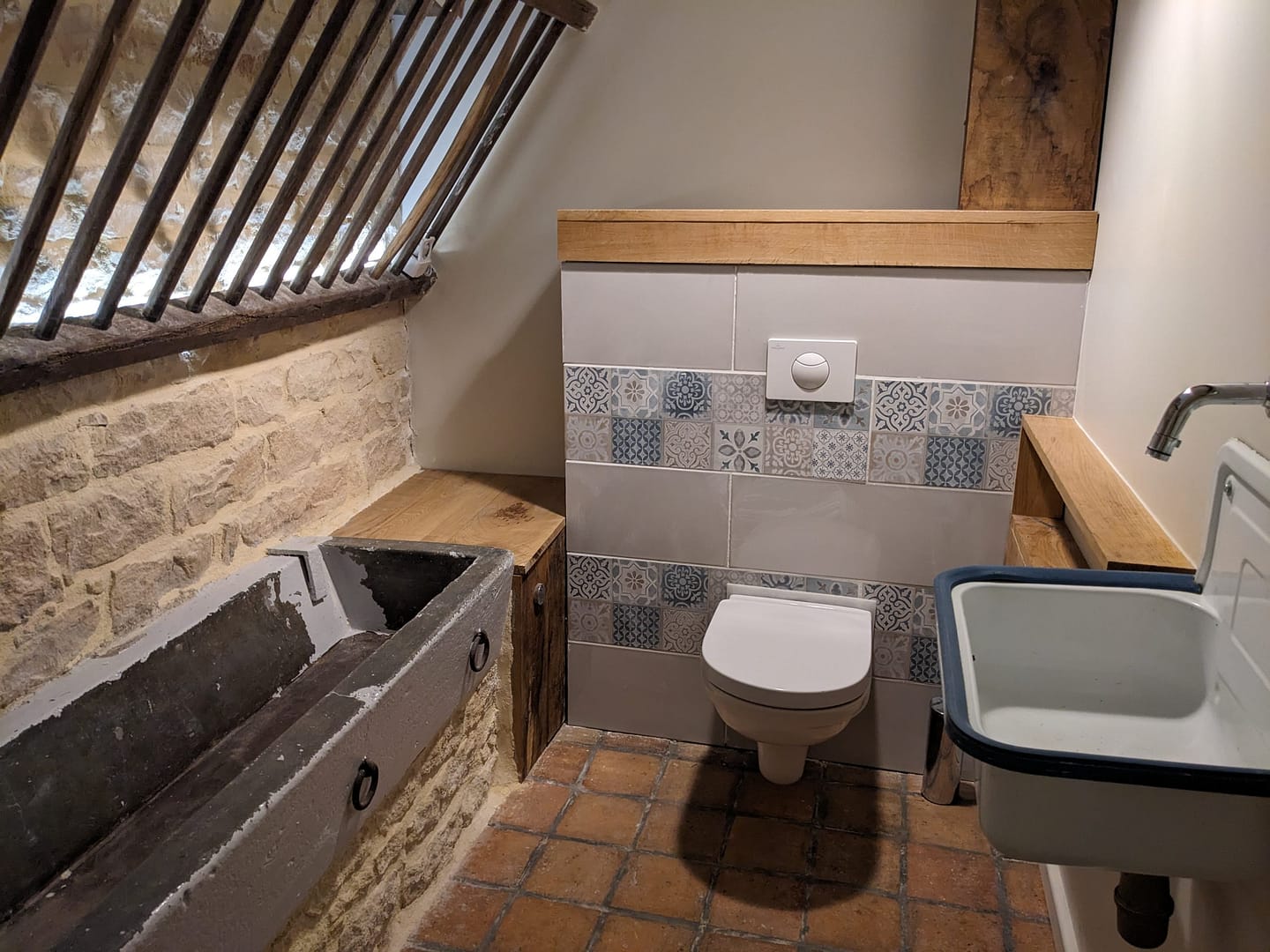 Back inside, the fourth Double Bedroom leads off from the main room and is completed by an ensuite WC featuring the original feeding trough along one wall, harking back to the Barn’s former existence.