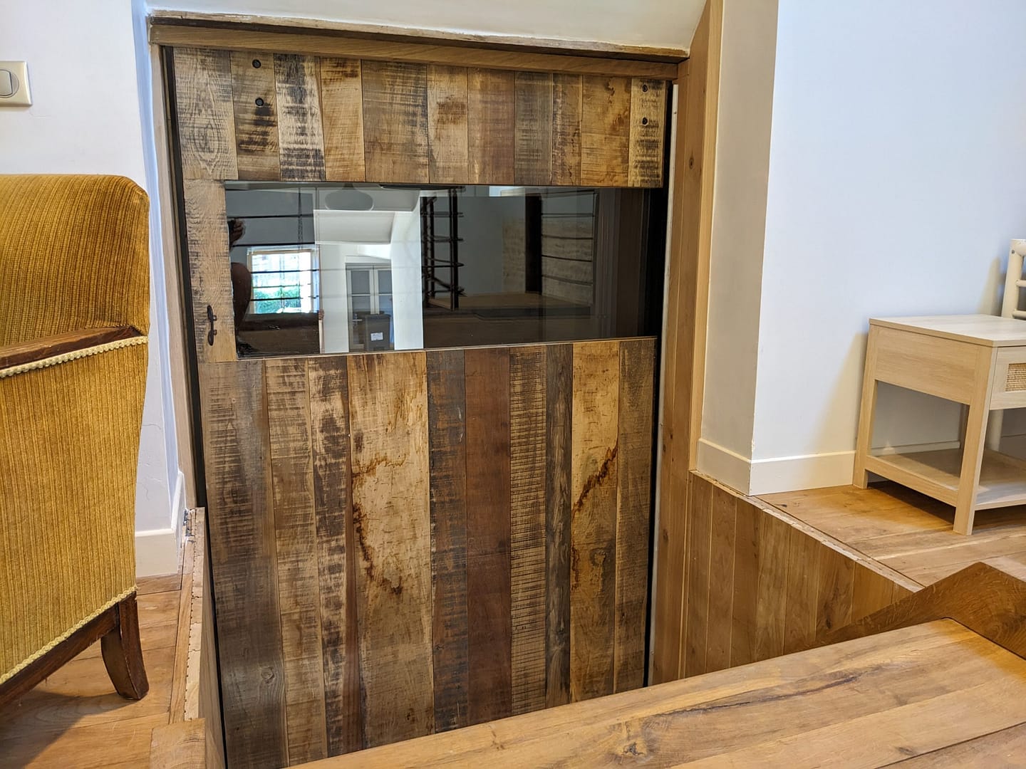 From the Mezzanine, an enormous custom made steel and wood staircase winds it way down to the ground floor of the Barn. Featuring traditional stone flooring with underfloor heating, the Barn covers an area of approximately 80m2 and is a stunning space for entertaining. A unique dining table made by a local artist dominates the centre of the room, whilst an old carpenter’s bench now converted into a mini kitchenette with fridge occupies one corner whilst a large corner sofa offers somewhere to relax. A dart board and table football offer additional entertainment.
