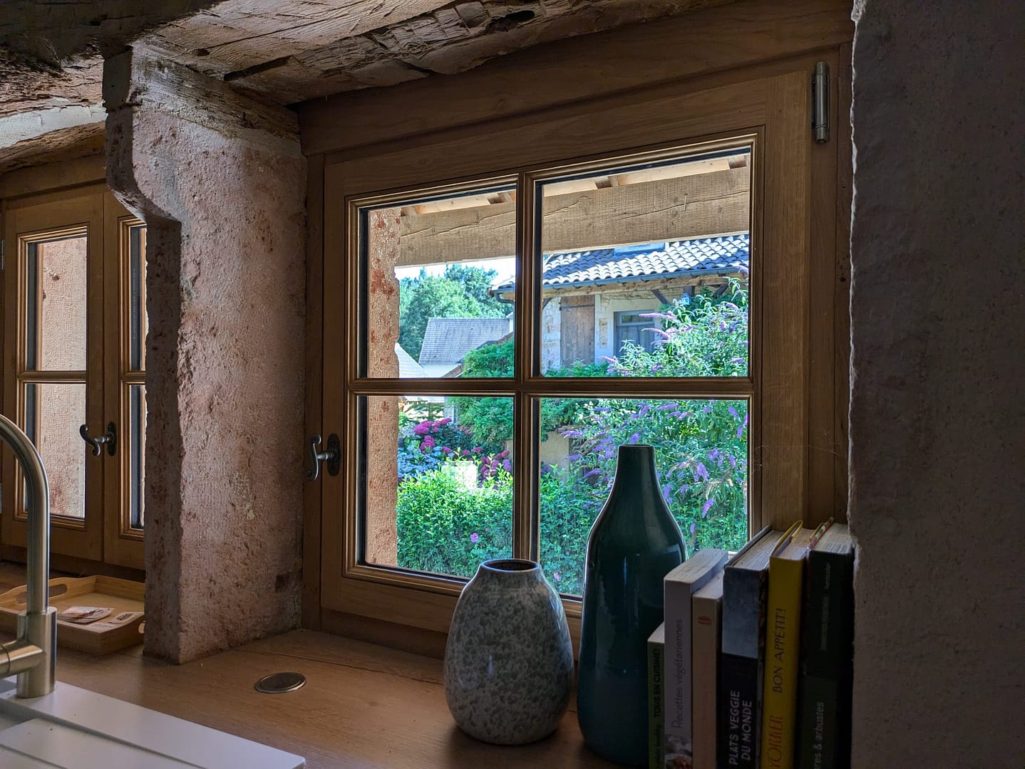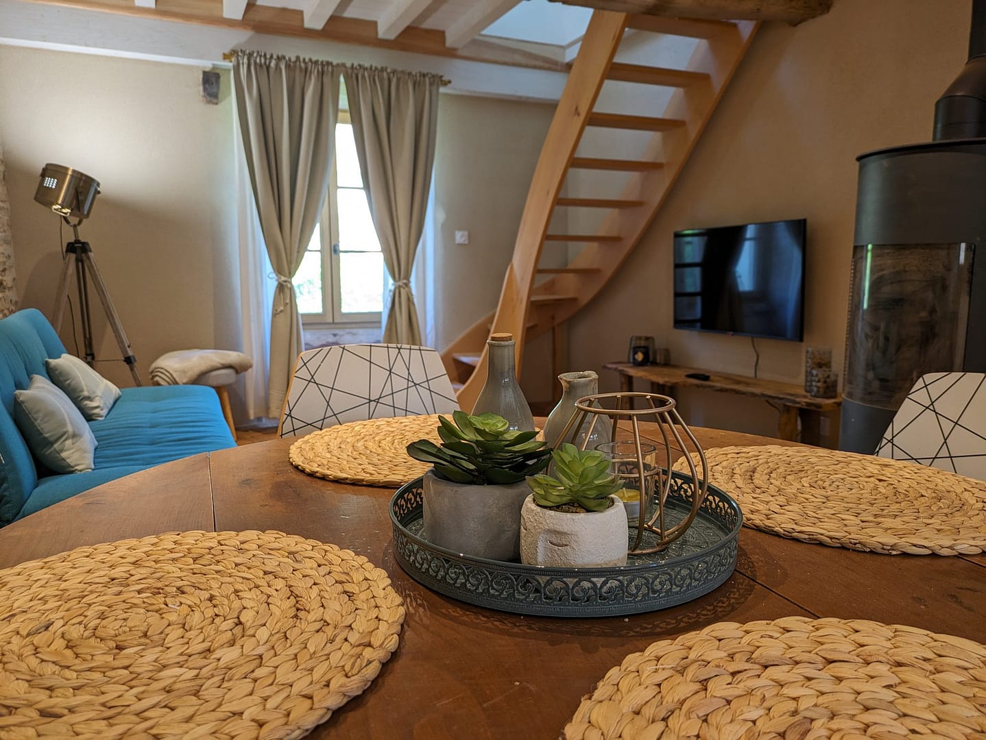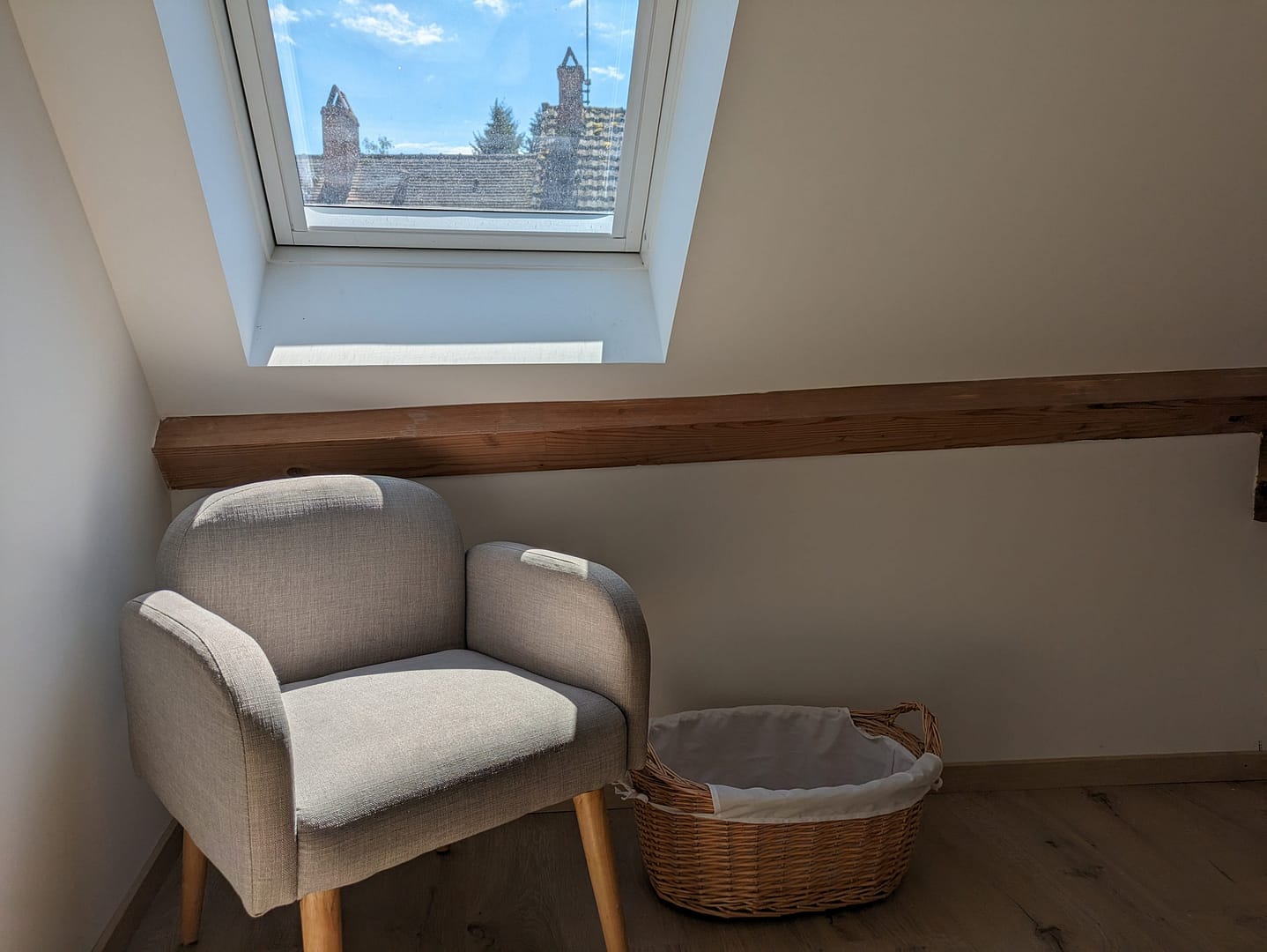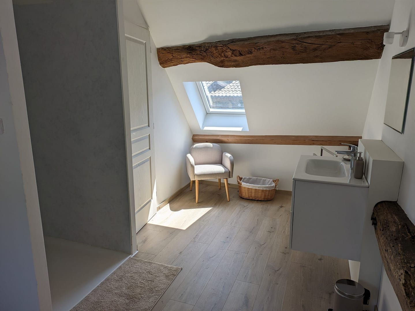 In the corner, a hand-made wooden staircase takes you upstairs, where a double bedroom with walk-in shower and separate WC await.